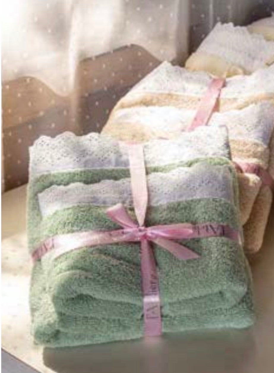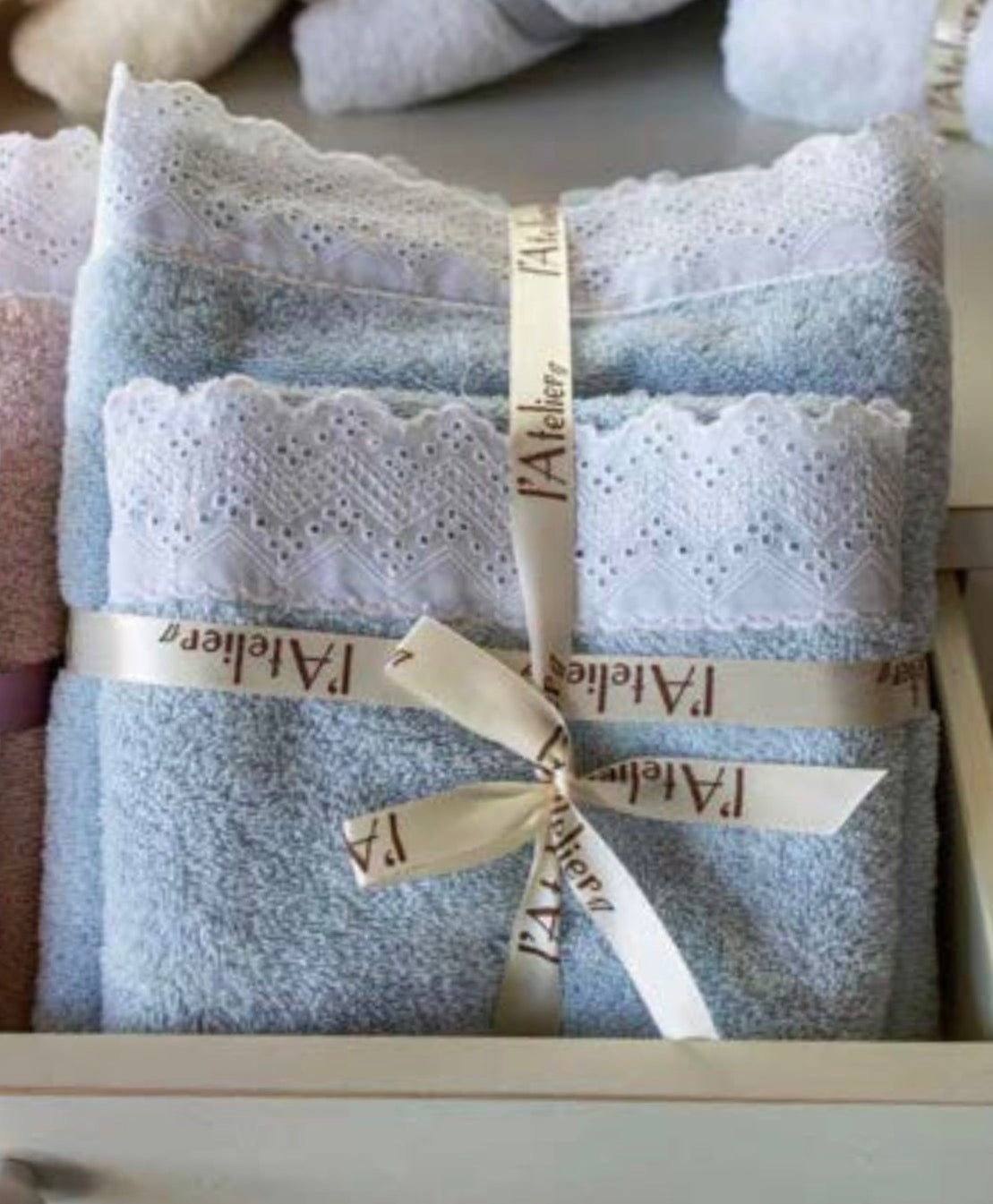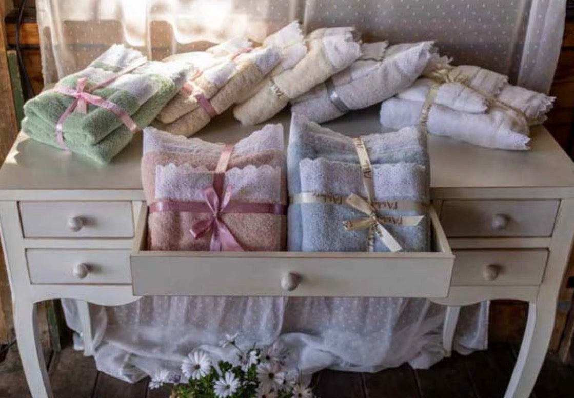Coppia asciugamano con bordo in pizzo sangallo. Disponibili in più varianti di colore