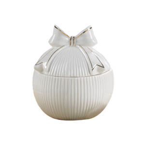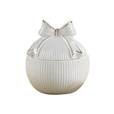 Barattolo con fiocco in porcellana lucida, impreziosito da rifilo color oro. Dimensione 8,5x8x9,5h