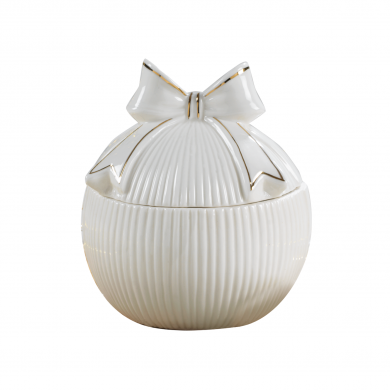 Barattolo con fiocco in porcellana lucida, impreziosito da rifilo color oro. Dimensione 11x10x12h