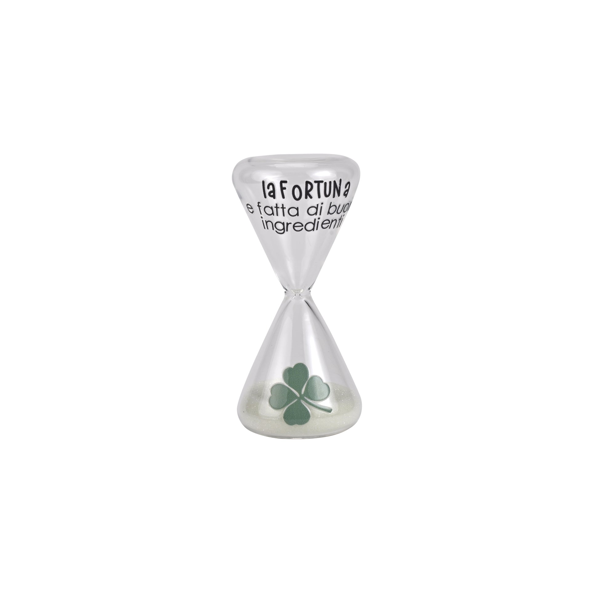 CLESSIDRA "QUADRIFOGLIO" in vetro borosilicato, un pezzo di design che unisce funzionalità e eleganza. Con le sue dimensioni compatte (Ø 4,5 x 9,5 cm h), questa clessidra è perfetta per chi apprezza gli oggetti di qualità. Il vetro borosilicato garantisce resistenza termica e durabilità nel tempo, mentre il suo profilo affusolato la rende un elemento decorativo raffinato per scrivania o mensola. Ideale come regalo, arriva in elegante gift box. Un accessorio che trasforma il passare del tempo in un momento di consapevolezza.