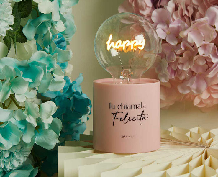 La lampadina trasparente si accende rivelando un filamento luminoso a forma della parola “happy”, trasformando questa lampada in un simbolo di gioia, amore e nuovi inizi. Con il suo stile minimal e romantico, è perfetta per decorare camere da letto, salotti, studi e angoli relax.