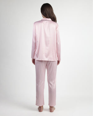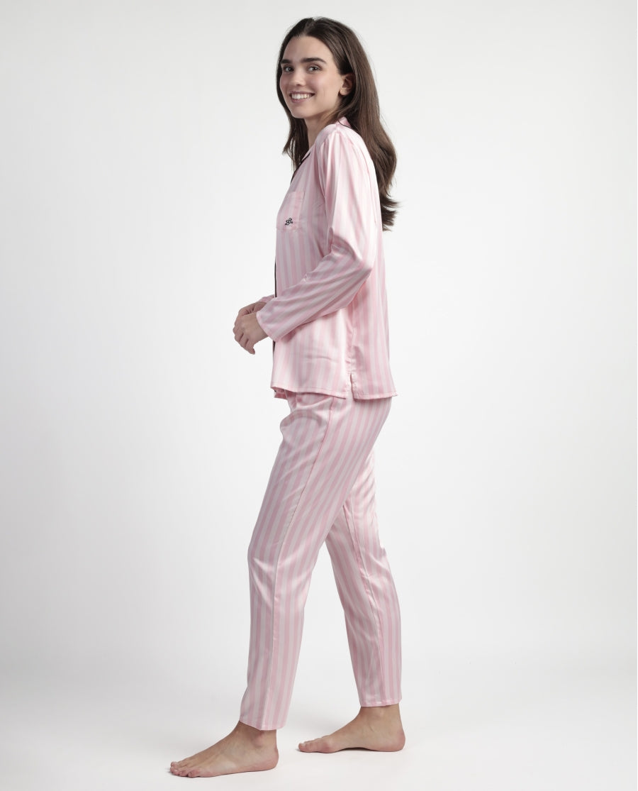 * Pigiama aperto realizzato in tessuto di raso, maniche lunghe, colletto con revers e pantaloni lunghi.