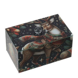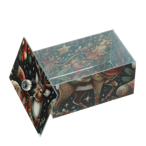 Questo elegante cofanetto in vetro, impreziosito con l'immagine di una renna, è perfetto per conservare piccoli ricordi o gioielli preziosi.