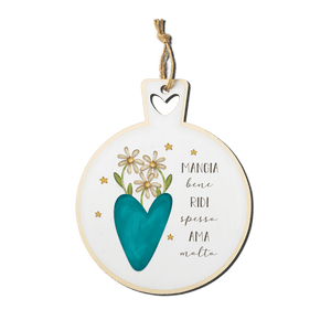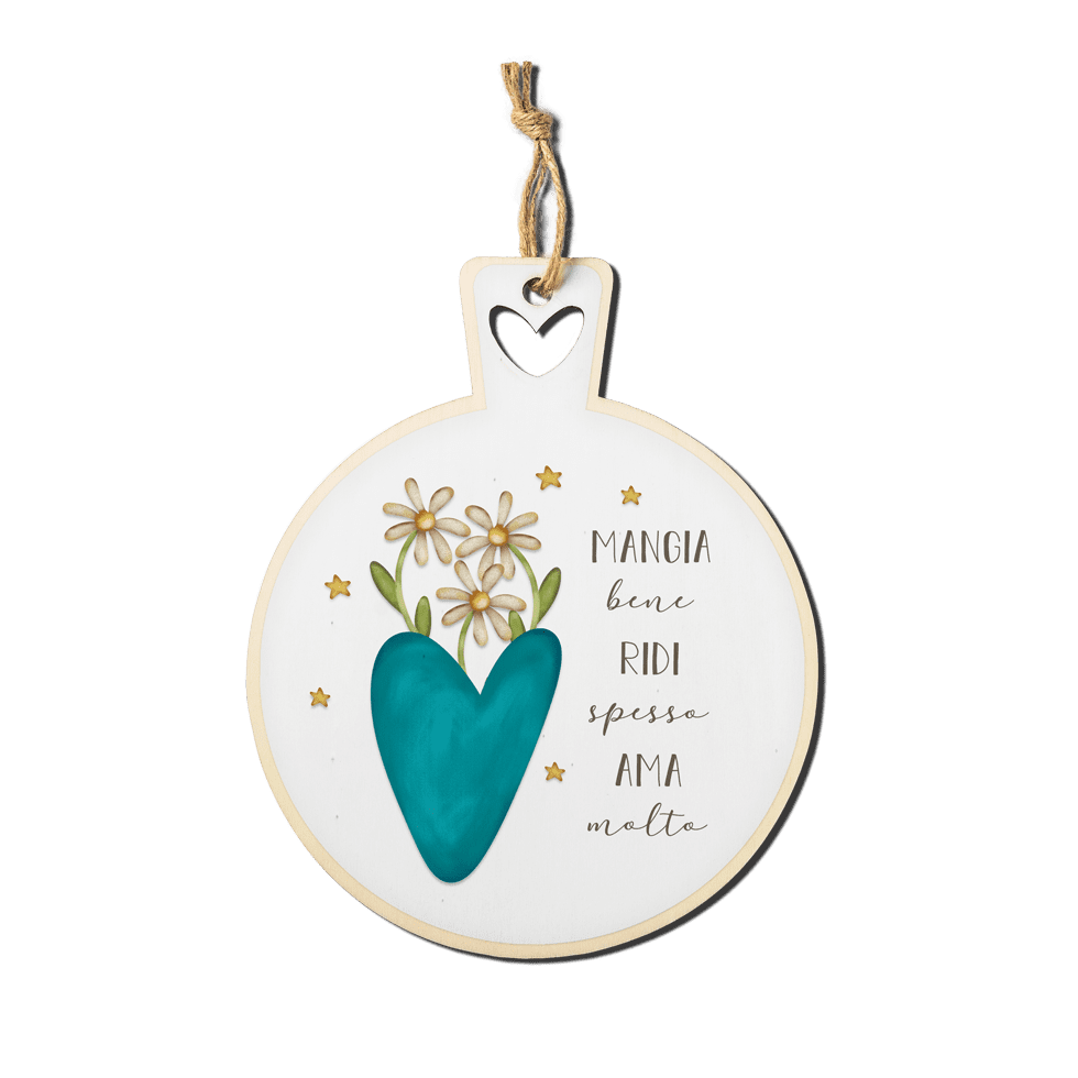 Questo sottopentola tondo con stampa colorata su legno naturale è un promemoria per una vita all’insegna della felicità.