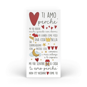 Ci sono mille motivi per amare, e ognuno merita di essere detto. La tavola Batticuore “Ti amo perché” è un pensiero romantico e d’arredo, perfetto per celebrare il vostro “noi”.In legno laccato con stampa colorata, si adatta a qualsiasi ambiente: appendila con il foro sul retro o appoggiala con il supporto incluso.Packaging compreso.